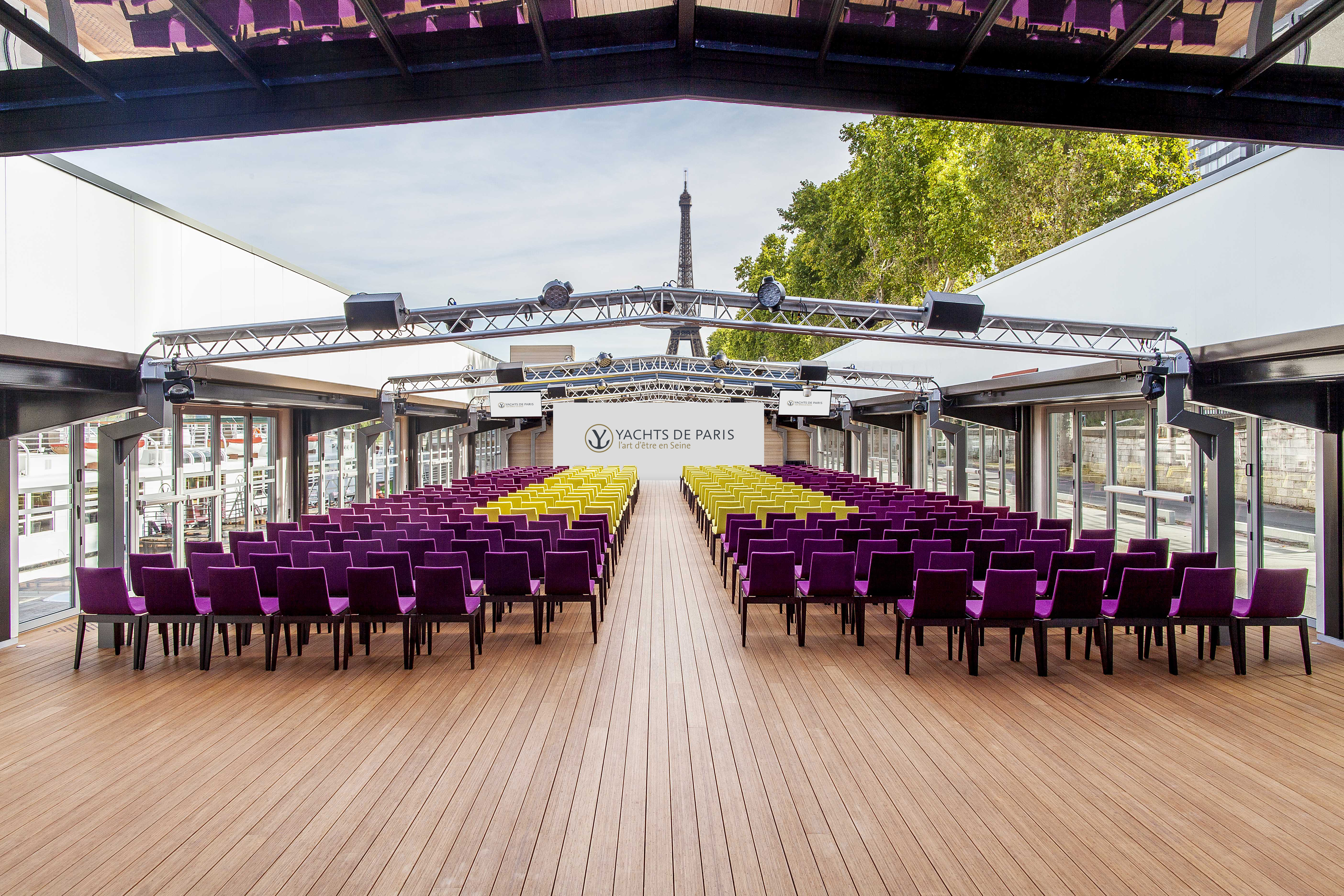 Bring your teams together for seminars or corporate conventions in this fully customizable setting on the banks of the Seine. Deliver impactful speeches thanks to the giant LED wall, organize breakout sessions by partitioning the spaces, and add a convivial touch to your event by offering your guests gourmet breaks throughout the day. In summer, let the glass roof open to the sky and the Eiffel Tower…