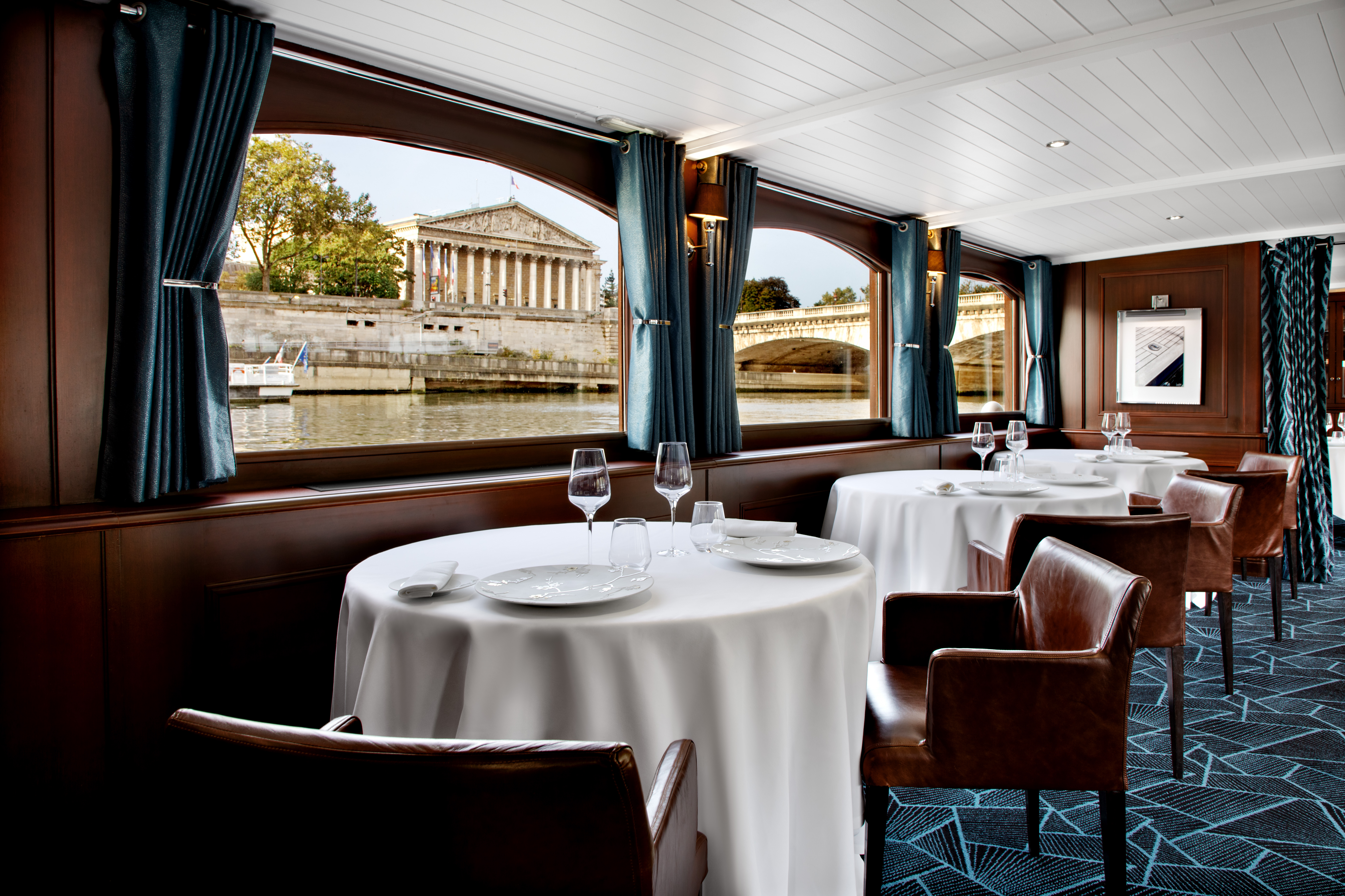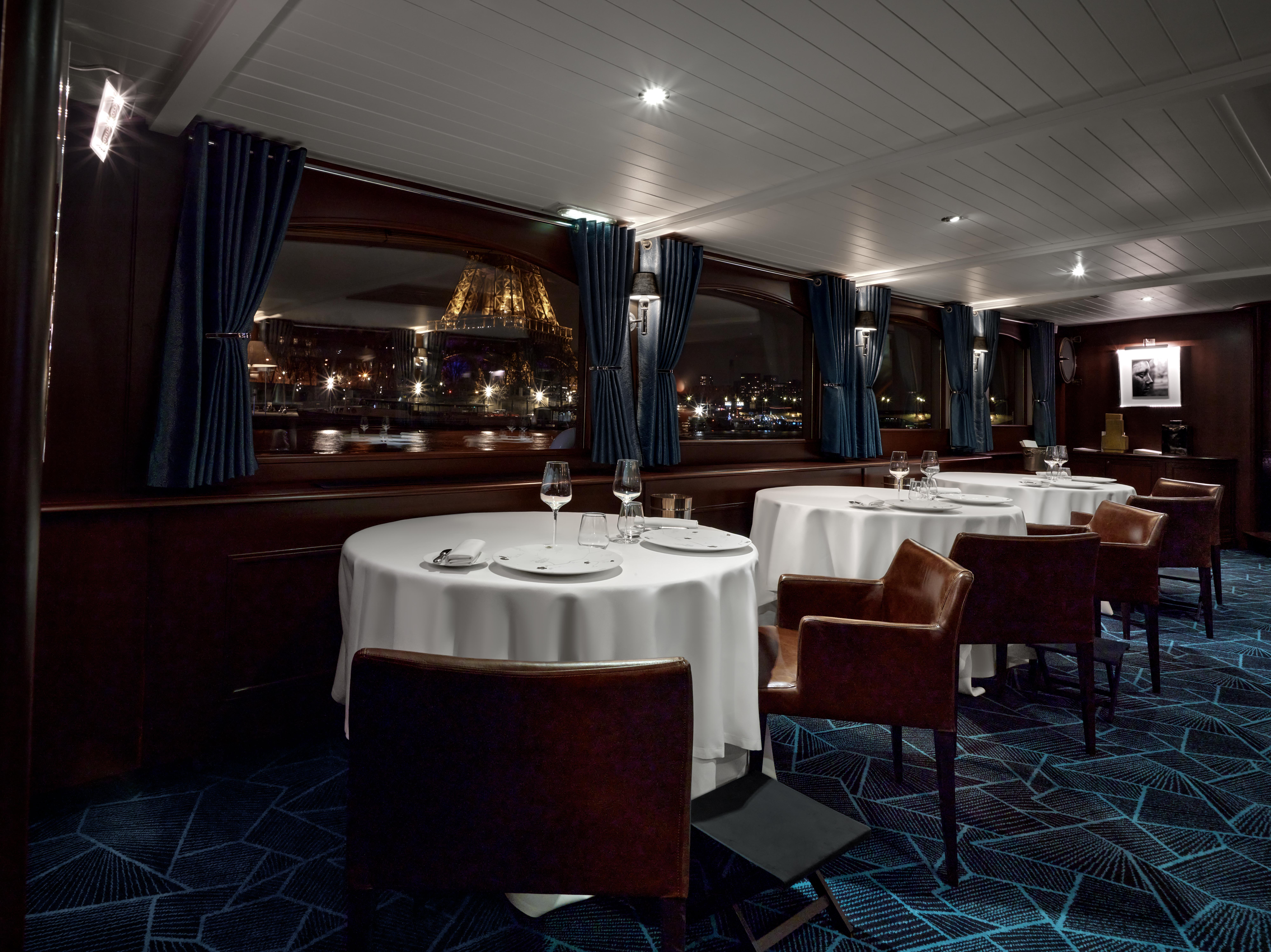 Confortablement installés, vos convives profitent d’un décor feutré dans le style Art Déco et des arts de la table d’un restaurant étoilé. Dans l’univers luxueux du yachting, chacun profite depuis sa table de vues imprenables sur les monuments de Paris.
